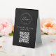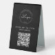 Professional modern minimalist QR code contactless black menu table tent sign. Custom black business template in a modern minimalist style which can be easily updated with your company logo, QR code and custom text.
