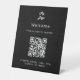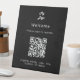 A classic black background, white coloured text. With the text: Welcome. Personalise and add your business logo, QR code and text.
