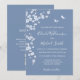 This dusty blue floral wedding invitation features cherry blossom branches on a dusty blue background. With bride and groom names in an elegant handwritten script. With a scannable qr code for your wedding website at the backside.