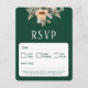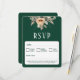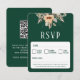 Dark green wedding RSVP response card with watercolor apricot flowers and garden foliage. A simple yet elegant contemporary botanical design inspired by boho vintage style. Includes space for QR code and wedding website address.