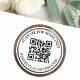 Round stickers with your QR code and custom text in an elegant serif font. Around is a brown wood grain, double border. Change fonts and font colours, move and resize elements with the design tool.