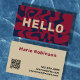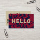 Hello in a bold font in neutral beige, on an asymmetric abstract design in navy blue and burgundy red, this version has a qr code on the back in black.