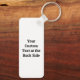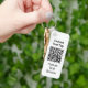 Custom QR code keychain. Custom background colour (use a light one). Custom text on both sides.