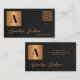 Stylish modern monogram initial and signature script name business cards with scanning QR code to website featuring a faux metallic gold copper square with initial letter over an elegant black leather like (PRINTED TEXTURE) background.