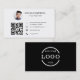 The front of the business card features a photo layout with the company name, employee's name/title, contact information, and QR code. Add your logo on the back. The background is black, but you can change it