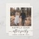 Budget-friendly light cream elopement or private wedding announcement and all-in-one wedding reception invitation. The front features your photo, "Happily Ever After Party" in a mix of simple typography and a stylish script with swashes and your first names and wedding or reception date joined together by a heart. On the back, personalise your details, input your wedding website address to create a QR code for guests to scan to see your wedding photos, all of the details and to RSVP online, and add your names in a signature-like script. This budget semi-gloss paper is similar in weight to photo paper. A larger 5x7 traditional card stock version is also available (message us for the link).