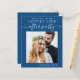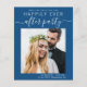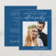 Modern budget-friendly classic blue elopement / private wedding announcement and reception save the date with your photo and "Save The Date For Our Happily Ever After Party" in simple white typography and a stylish white script with swashes. Under your photo, add your names, reception date and location; on the back, personalise your wedding announcement, input your wedding website address to create a QR code for your guests to scan for more information and add your names in a signature-like script.