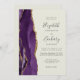 The left-hand edge features a purple watercolor agate border trimmed with gold faux glitter. The customisable text combines gold-coloured handwriting, copperplate and italic fonts on an ivory background. The reverse side provides space for wedding details on a solid ivory background, along with a QR code guests can scan to visit your website and RSVP, which saves the cost of printing and mailing separate RSVP cards.