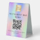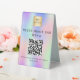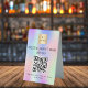 Holographic, pink, purple, mint green background, black coloured text. With the text: Restaurant Bar Menu and Please scan to view our menu and order. Personalise and add your business logo, QR code and text.