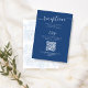 This design features a QR code website online reception enclosure card, with a URL scannable scan online, a guest more information or response, a respond via website QR code, modern simple elegant minimal colour, elegant casual simple respond enclosure, stylish trendy calligraphy script, modern calligraphy typography text, simple minimalist minimal design, blue floral colour wedding theme