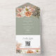 Elegant sage green all-in-one wedding invitation featuring watercolor florals in peach, ivory, and blush with pampas accents. Includes a scannable QR code and website for easy RSVP tracking. Perfect for eco-conscious couples who want a modern, paper-saving design without extra envelopes. Customise with your wedding details for a chic, convenient, and stylish celebration.