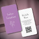 QR code girly business card, with a simple flower design on a purple background. With customisable lettering, you add your own information.You also add your website to the QR field for connecting with your clients. Great for promoting your consultant business with a floral style.