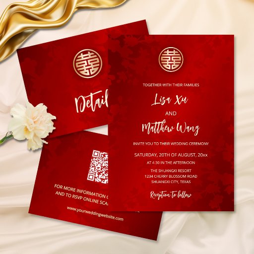 This traditional Chinese wedding invitation features a gold double happiness symbol on a floral ruby red shimmering background. The elegant handwritten script gives the design a modern touch. You can easily change the line, that says: "invite you to their wedding ceremony" to "tea ceremony". The invitation has a scannable qr code at the backside for your wedding website.