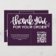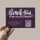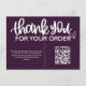 Express your gratitude with our purple QR Code "Thank You for Your Purchase" Card Package Insert. Your customer scan the QR code to reveal a heartfelt message, exclusive offers, or a personalised thank-you note, adding a special touch to your customer's shopping experience. Show appreciation and foster loyalty with this innovative and thoughtful package insert.
