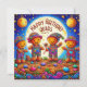 Four cute gingerbread men are on another planet celebrating the birthday of quads. They are brightly dressed and ready for exploration. The back of the card has a small replica of the front image and plenty of room to write a message. AI Bing assisted in the creation of the card.