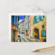 A cute postcard design. A quaint cobblestone street with buildings made of sandstone with arched doorways and wooden shutters giving it an old world charm with its narrow streets and contrasting blue and brown colours give a feeling of warmth and friendliness. A charming scenic picturesque image.