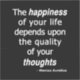 Quality Thoughts? Then a Happy Life… The actual quote from Roman Emperor and philosopher Marcus Aurelius is: "The happiness of your life depends upon the quality of your thoughts: therefore, guard accordingly, and take care that you entertain no notions unsuitable to virtue and reasonable nature." White text over black sticker.