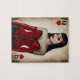 Pinup style queen of hearts design with grunge effects. Features an illustration of a beautiful young woman, with long black hair, wearing a red corset.