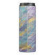Quiet Reign is an abstract piece defined by its soothing, cool color palette and energetic brushwork. The painting features diagonal sweeps of soft lavender, tranquil aqua, and deep violet, punctuated by bold, shimmering metallic gold accents. The overall effect is one of serene motion, like a gentle rain shower illuminated by a hidden golden light. This artwork adds a touch of modern, peaceful sophistication to any space or product.
