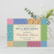 Celebrate any occasion with this 5 x 7 invitation featuring a design resembling an old-fashioned patchwork gingham quilt in shades of blue, rose, cream green, golden yellow, and aqua. Make it unique and change the text using the easy provided templates and the 'Customise It!' feature. This sample shows how it would look for a 90th birthday celebration but it can be personalised for any landmark birthday, special occasion or event. Both front and back of the invitation includes custom artwork and all text can be edited.