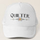 Quilter text with a decorative line sporting a needle and thread is a unique design for birthdays and holidays.