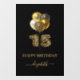 For a girly and glamourous Quinceañera, 15th birthday party. A black background, decorated with balloons. With the text: Happy Birthday. Personalise and add a name. The name is written in dark rose gold with a modern hand lettered style script with swashes. Number 15 is written with a trendy balloon style font, leopard pattern. To keep the swashes only delete the sample name, leave the spaces or emoji's in front and after the name.