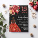 A modern, stylish and glamourous invitation for a Quinceañera, 15th birthday party. A black background, a girl wearing a red and gold dress, red bow, red and pink and golden roses, florals. The name is written with a modern hand lettered style script. Personalise and add your party details.