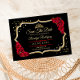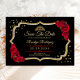 Black red and gold Quinceanera celebration Save The Date card. Features, script font, red roses, tiara and confetti. Perfect for an elegant princess style glam celebration. Personalize with your own details. Printed Zazzle cards or instant download digital printable template.