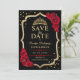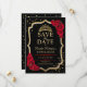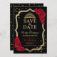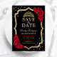 Black red gold Quinceanera celebration save the date card. Features, script font, roses and tiara. Perfect for an elegant princess style glam celebration. Personalize with your own details. Printed Zazzle cards or instant download digital printable template.