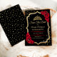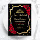 Gold black white Quinceanera celebration save the date. Features script font, red roses, tiara and confetti. Classy design with faux glitter gold. Perfect for an elegant glam celebration. Personalize with your own details. Printed Zazzle cards or instant download digital printable template.