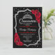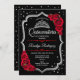 Features script font, red roses, tiara and confetti. Classy design with faux glitter silver. Perfect for an elegant glam celebration.