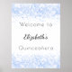 A welcome poster for a girly and glamourous Quinceañera, 15th birthday party. A white background decorated with light blue, baby blue faux glitter dust. Personalise and add a name and age. Black letters.