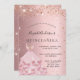 A modern, stylish and glamourous invitation for a Quinceañera, 15th birthday party. A blush pink metallic looking background with rose gold faux glitter and a pink ballgown. The name is written with a modern hand lettered style script. Personalise and add your party details.