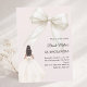 This sophisticated design features a large ivory bow adorned with delicate pearl details, paired with a graceful gown illustration. A soft blush pink colored background.