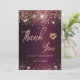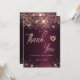A thank you card for a Quinceañera, 15th birthday. A deep burgundy background color. With rose gold faux glitter, sparkles and a heart. On front a large hand lettered script and the text: Thank You, your text, title and a date.