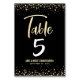 No Quinceañera party is complete without personalised table number cards. Let your daughter be proud, rejoice and celebrate her milestone at her perfectly coordinated party. Stunning, modern, sparkly gold faux foil handwritten script and tiny confetti glitter dots overlay a sophisticated, dramatic black background. Personalise the custom text with the table number, her name, and date of event. Change the number for each table that you need and add one at a time to your cart. Guaranteed to add stylish memories of her occasion. Matching and coordinating invites, envelopes, address labels, stickers, napkins and other Quinceañera goodies are also available in this trendy and special collection.