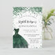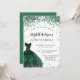 A modern, stylish and glamourous invitation for a Quinceañera, 15th birthday party. On the front: A white background with green sparkles, an emerald green dress. The name is written with a modern hand lettered style script. Personalise and add your party details.