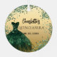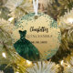 For an elegant Quinceañera, 15th birthday. A faux gold looking background. Decorated with an emerald green dress and green confetti. Personalise and add a name and a date.