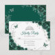 Emerald green silver and white floral Quinceanera RSVP reply card. Features, script font, silver butterflies, watercolor roses and tiara. Perfect for an elegant princess style glam celebration. Personalize with your own details.