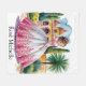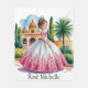 A watercolor-style illustration of a young girl in an ornate quinceañera dress standing in front of a Spanish colonial-style building. The dress is white with a dramatic full skirt decorated with pink floral patterns along the hem, featuring a pink bodice with short cap sleeves. Her hair is styled in an elegant updo with pink accessories, and she wears matching pink earrings. The background shows a yellow and red building with arched doorways, domed towers, and Spanish architectural details. The landscaping includes tall cypress trees, a palm tree, and desert plants. The sky is painted in soft blue watercolor with wispy clouds. The illustration has a dreamy, romantic quality with soft edges and gentle colour transitions. The ground shows a stone pathway, and the overall colour palette consists of yellows, pinks, greens, and soft blues.
