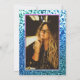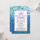 A modern, pretty chic and elegant blue glitter invite with bokeh lights with a photo on the back side.