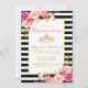 Elegant Watercolor Pink Blush Floral, Gold Crown, Black and White Stripes Quinceanera Invitation Card