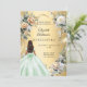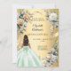 A faux gold looking background. Decorated with white and yellow florals, sage green greenery, a golden ribbon. A girl wearing a tiara and a green dress. Personalise and add a name and details.