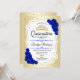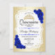 Features script font, royal blue roses, tiara and confetti. Classy sapphire blue design with faux glitter gold. Perfect for an elegant glam celebration.