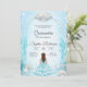 Quinceañera invitation with an ocean theme. Features a girl in a blue dress surrounded by seashells and seaweed, soft blue background, warm tone.