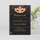 For an elegant Quinceañera, 15th Masquerade themed birthday party. A stylish black background. Decorated with purple faux gold glitter dust and a golden masquerade mask. Personalise and add a name, age and party details. The name is written with a hand lettered style script