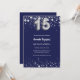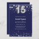 A modern, stylish and glamourous invitation for a Quinceañera, 15th birthday party. A navy blue background, decorated with faux silver stars. Personalise and add your name and party details. Number 15 is written with a balloon style font.