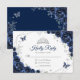 Navy silver and white floral Quinceanera RSVP reply card. Features, script font, silver butterflies, watercolor roses and tiara. Perfect for an elegant princess style glam celebration. Personalize with your own details.