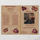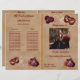 An elegant Quinceañera program with traditional Old English Red Roses, golden butterflies, a red mask and pearls.