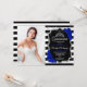 Quinceanera party invitation with your photo. Features black white stripes, script font, royal blue roses, tiara and confetti. Classy black white sapphire blue design with faux glitter silver. Perfect for an elegant celebration.